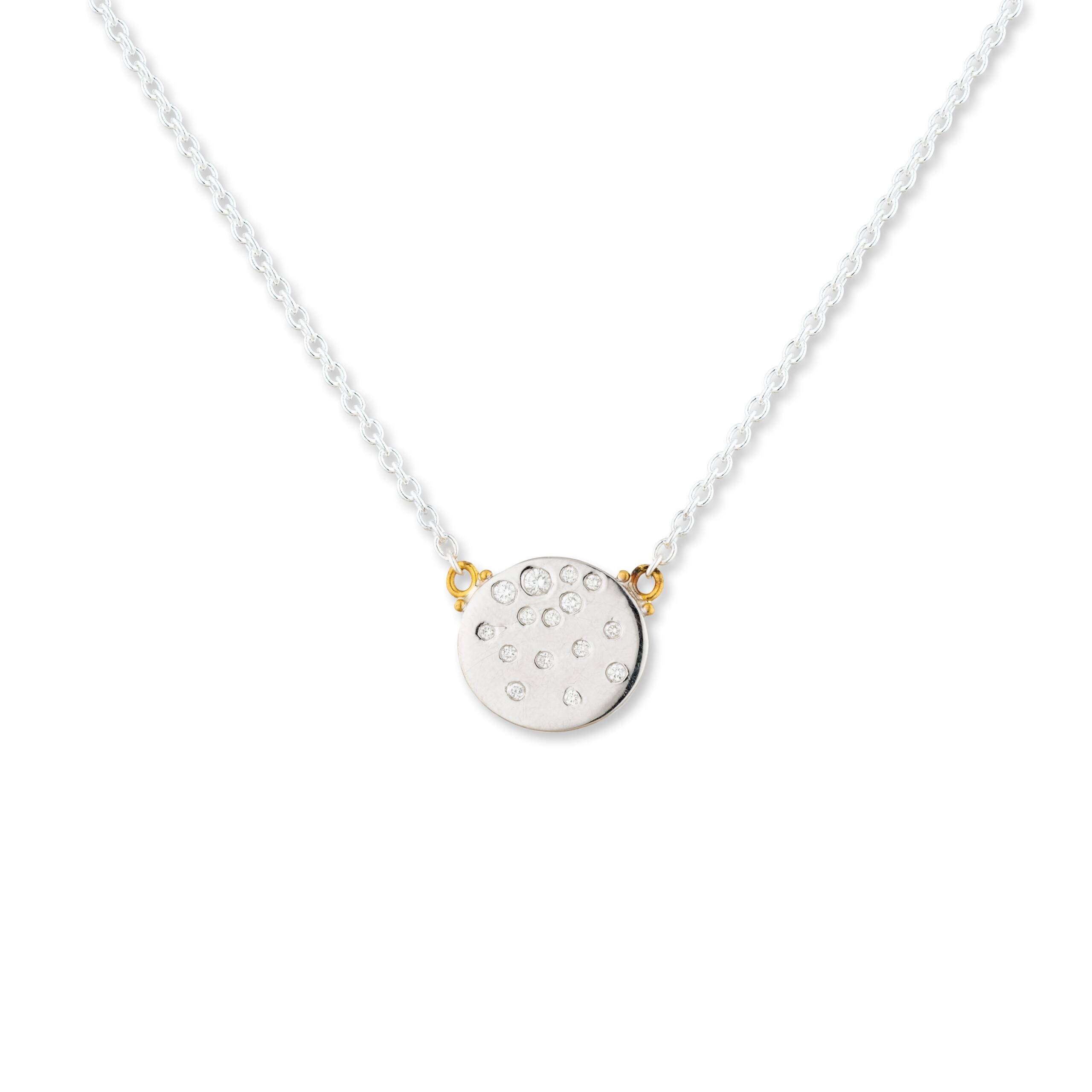 24K GOLD AND HIGH POLISHED STERLING SILVER “CACHET DIAMOND SPRINKLE” NECKLACE, DIAMONDS, 50 GG STERLING SILVER ADJ CHAIN, approx 14X16mm