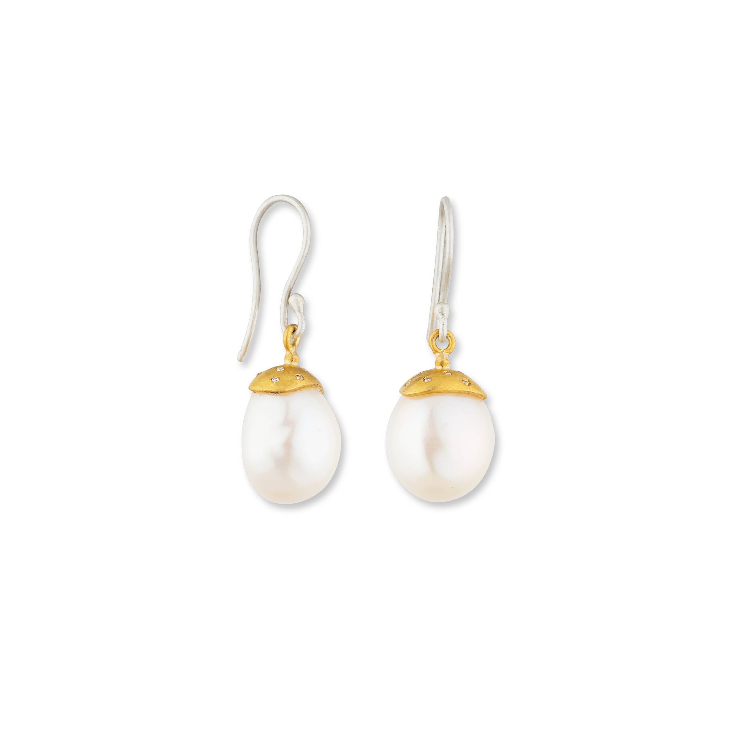 24K GOLD LIMITED EDITION FRESHWATER WHITE PEARLS “LYDDIE” EARRINGS WITH DIAMONDS, STERLING SILVER EARWIRES,12×15 mm pe