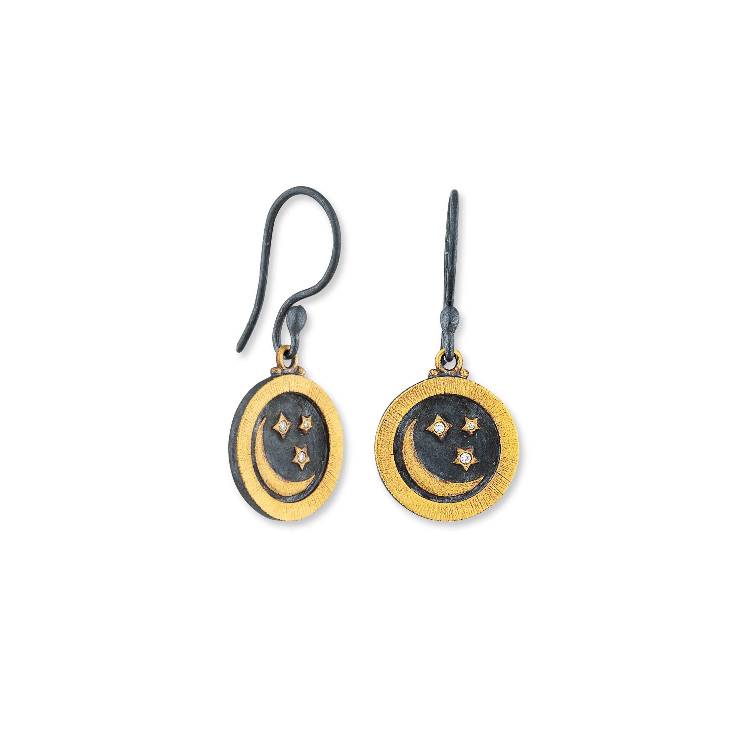 24K GOLD & STERLING SILVER HALF MOON AND STARS “MEDALLION” EARRINGS, DIAMONDS, OXIDIZED SILVER EARWIRES