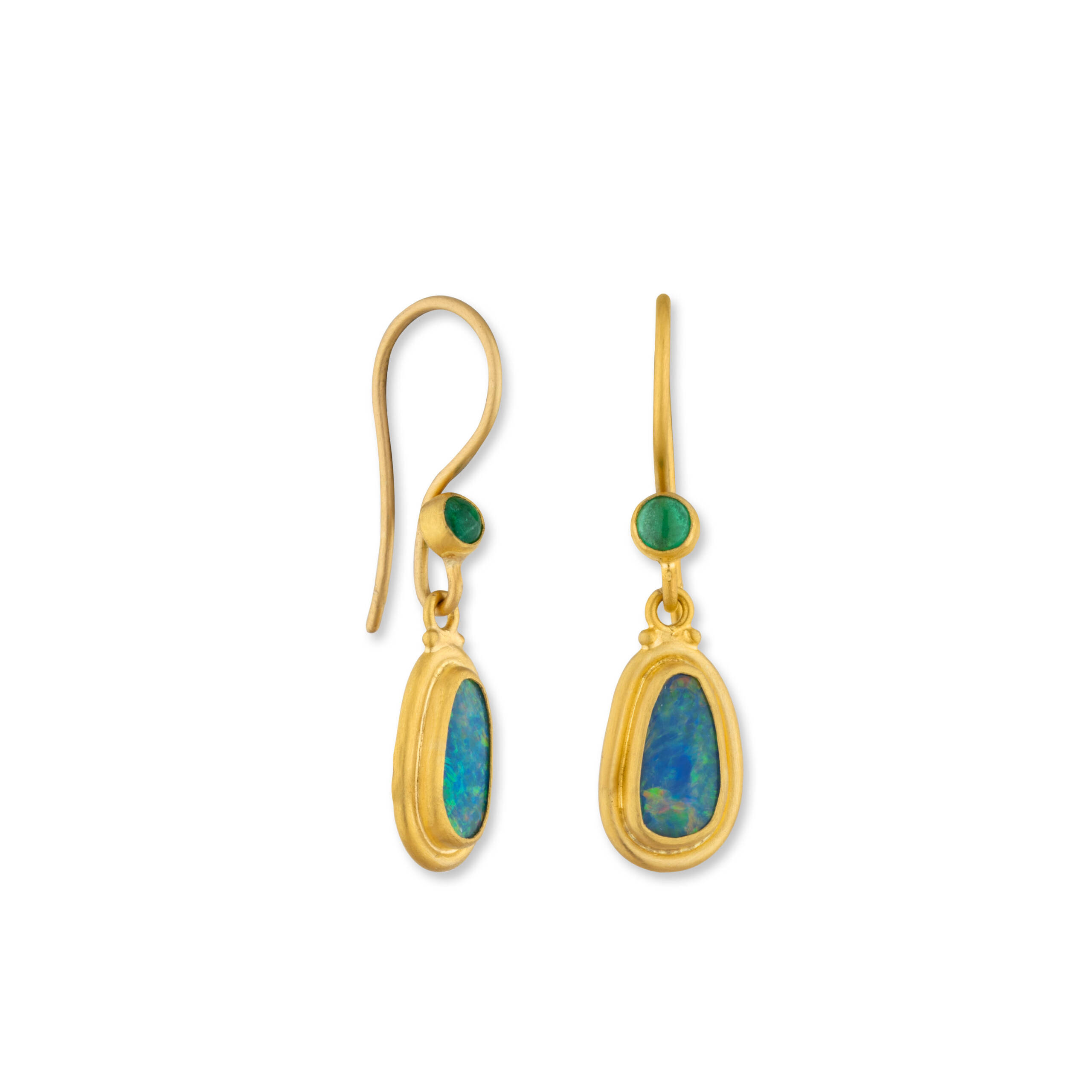 24K GOLD “MONET’S GARDEN” OPAL DOUBLET EARRINGS, 22K GOLD EARWIRES, 5×11 mm opd, 2mm em. ONE OF A KIND