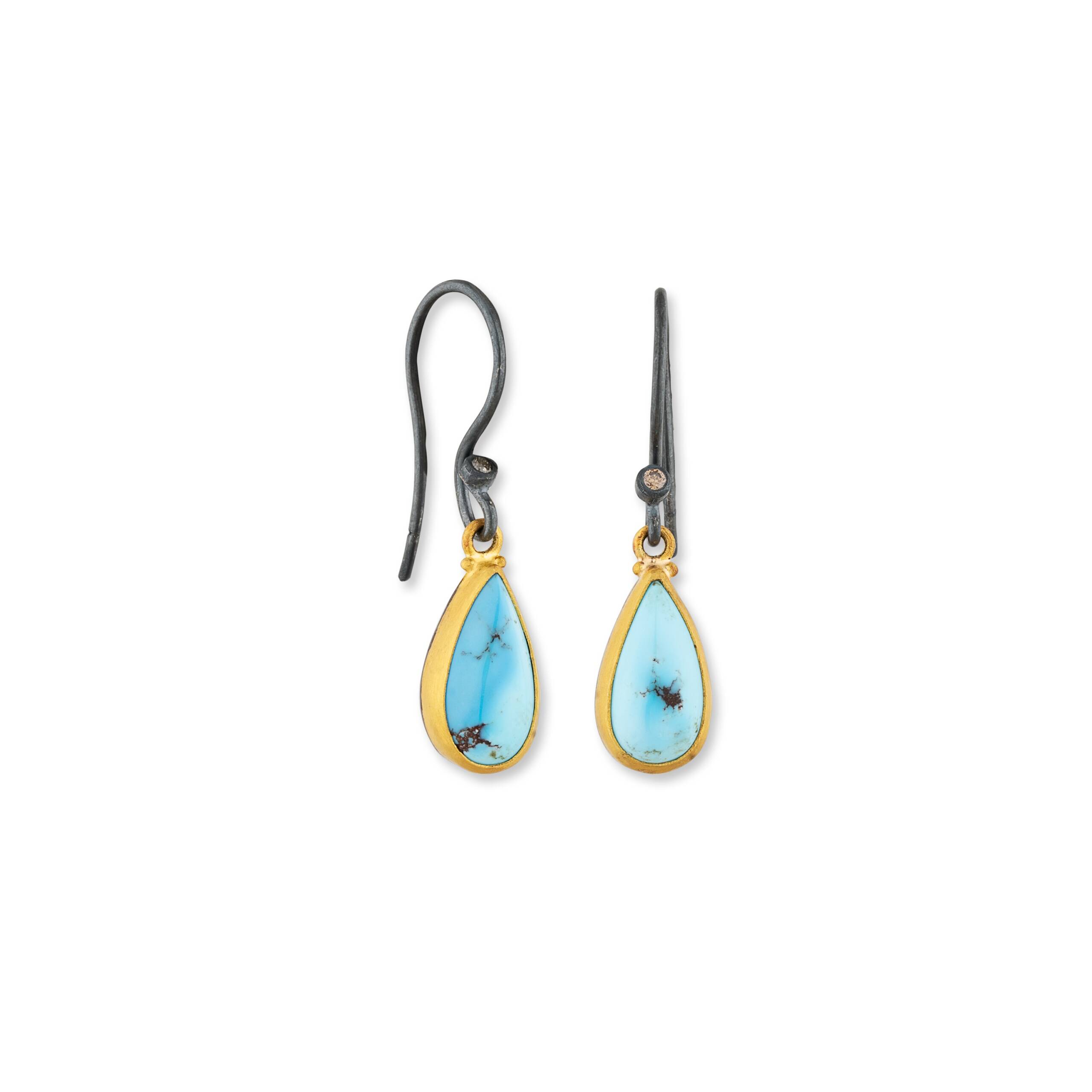 24K GOLD & OXIDIZED SILVER ONE OF A KIND PEAR SHAPE CABOCHON GOLDEN HILL TURQUOISE “MY SKY” EARRINGS, COGNAC DIAMONDS ON OXIDIZED SILVER EARWIRES,7X12 mm tq