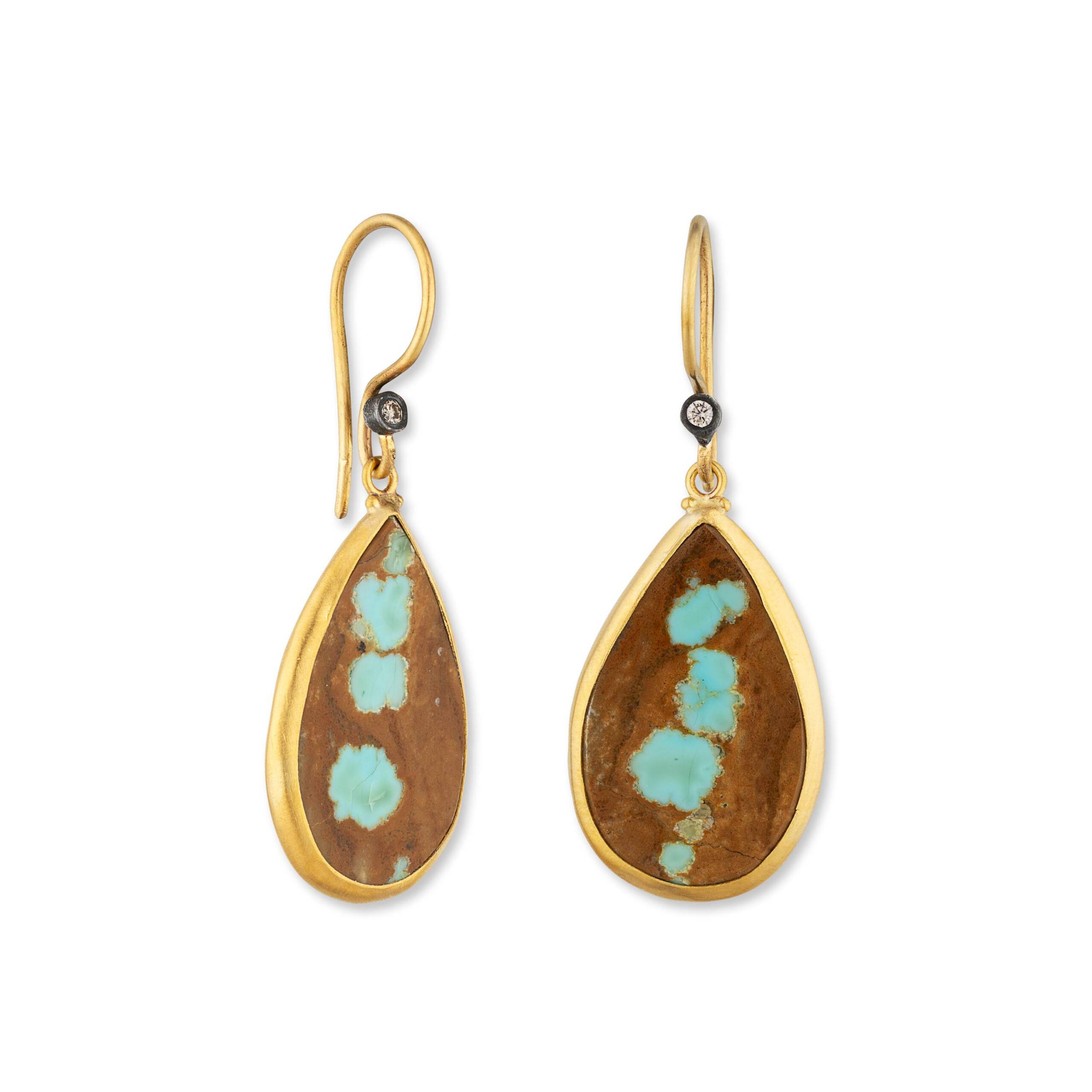 24K GOLD & OXIDIZED SILVER “MY WORLD” NEVADA#8 TURQUOISE EARRINGS , 22K EARWIRES WITH COGNAC DIAMONDS SET IN OXIDIZED SILVER, 15X24 mm tq, ONE OF A KIND