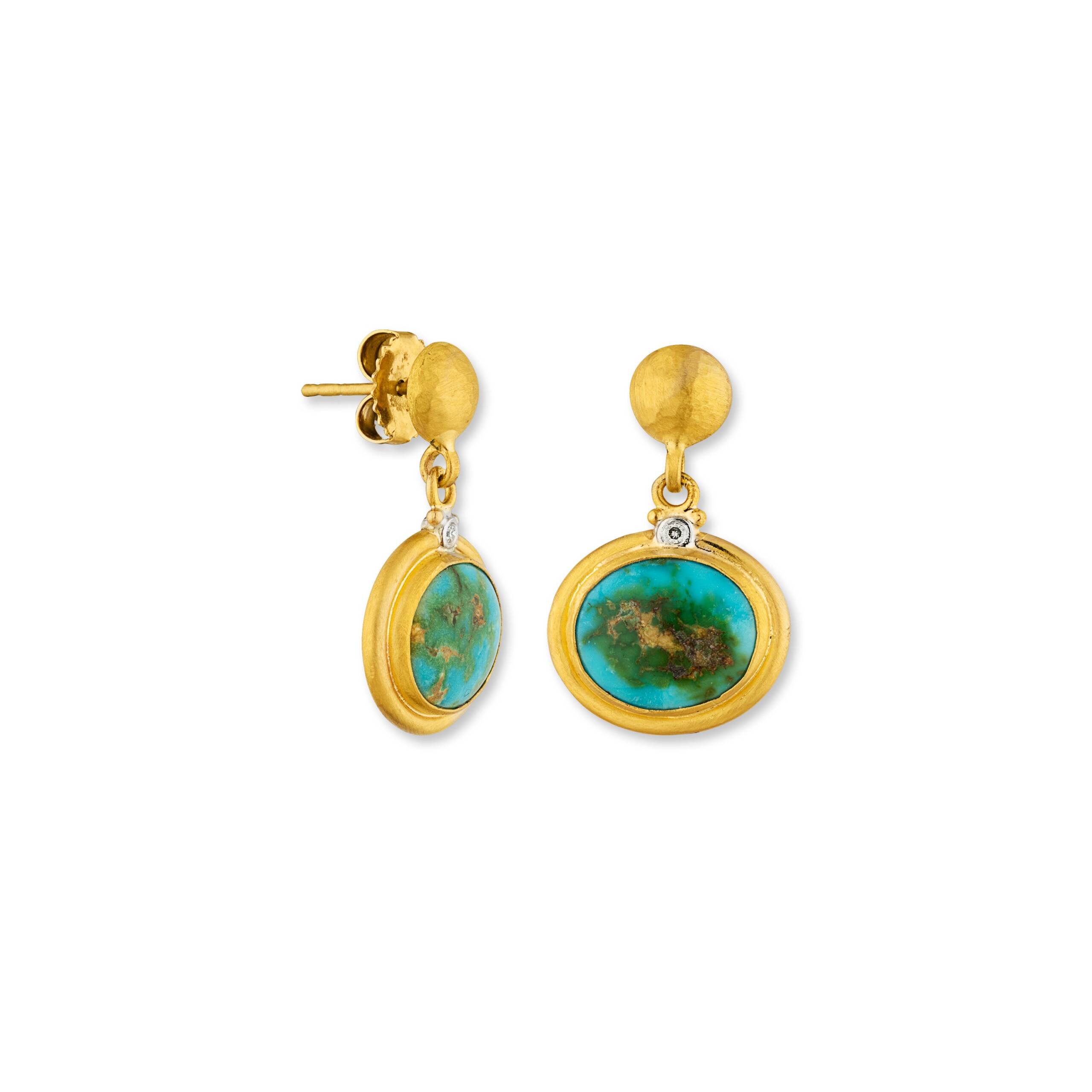 22K GOLD “SONORAN SUNSHINE” SONORAN TURQUOISE EARRINGS, DIAMONDS SET IN 18K WG, BUTTON TOPS, 18k gold posts and backings, 10×11.5mm tq.,approx 25mm height ONE OF A KIND