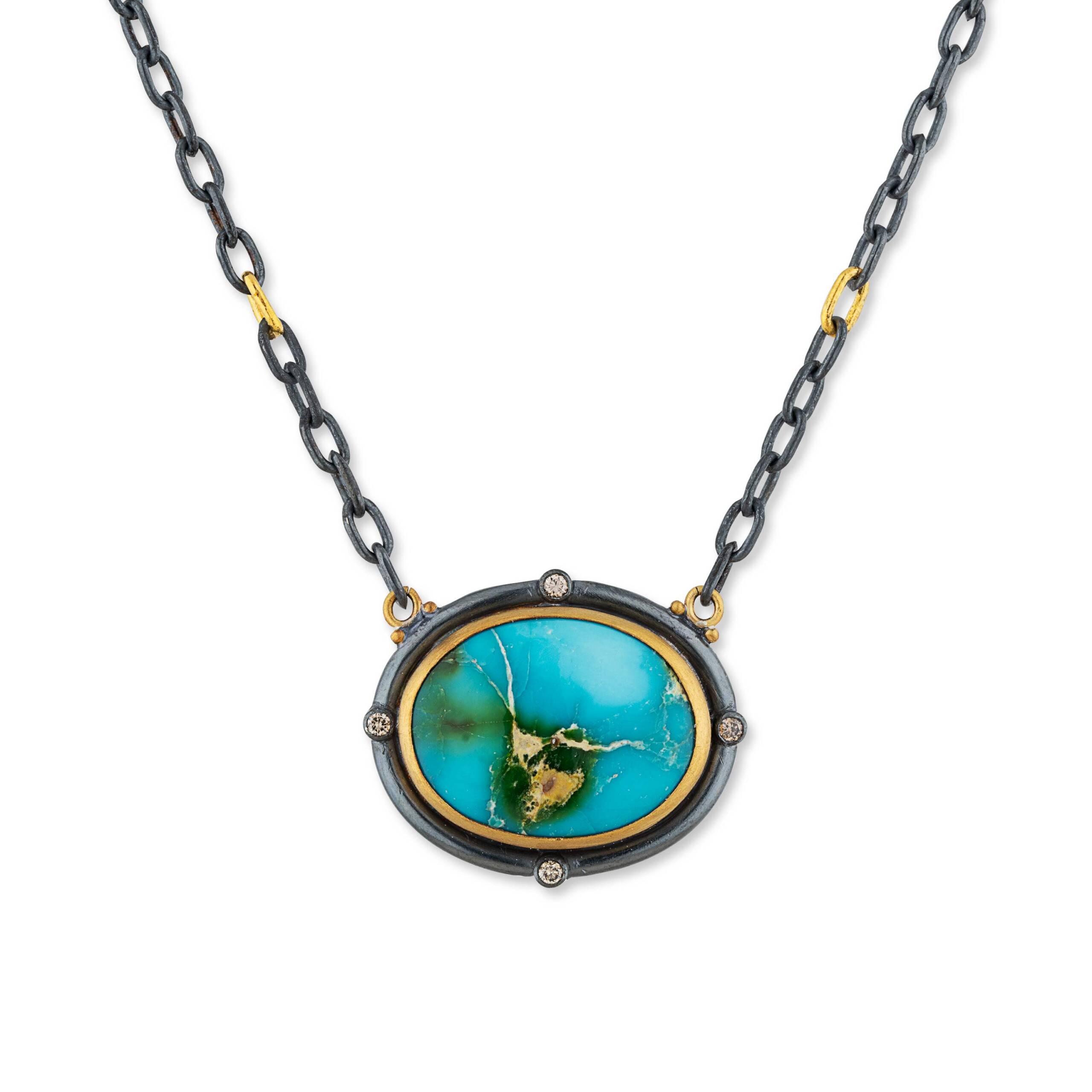 24K GOLD & OXIDIZED SILVER “SONORAN SUNSHINE” ONE OF A KIND OVAL SONORAN TURQUOISE NECKLACE, COGNAC DIAMONDS, 80GG OXIDIZED SILVER CHAIN W GOLD LINKS, 16X21mm tq